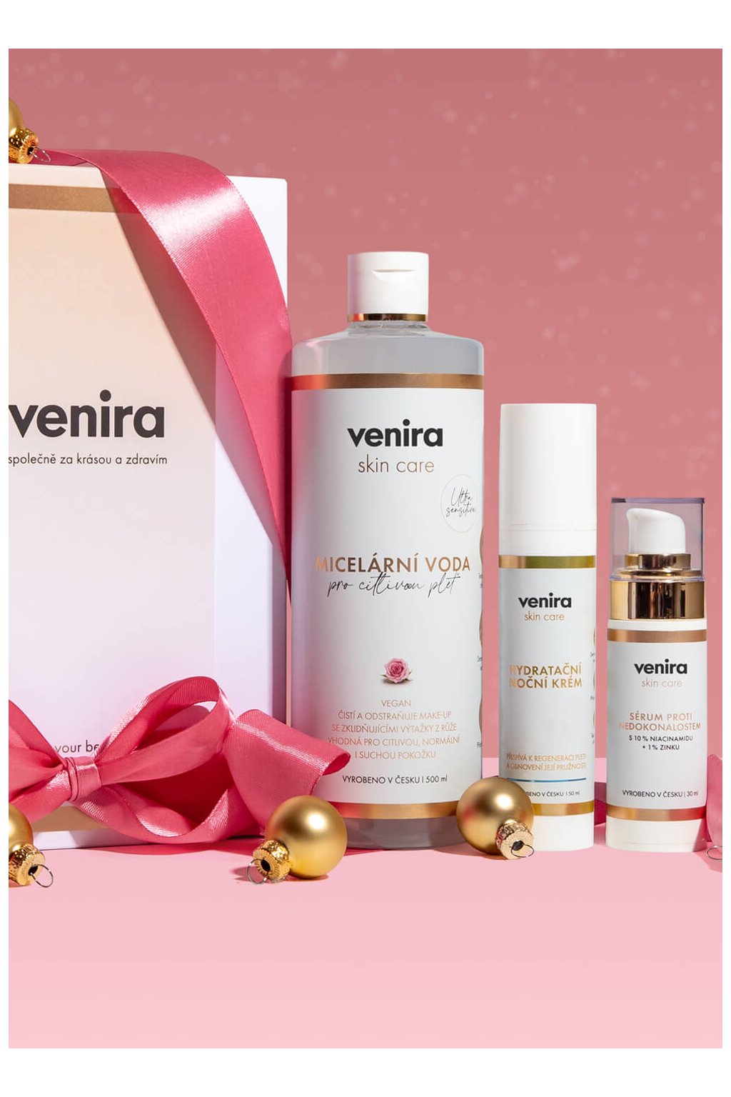 VENIRA darčeková sada nočnej starostlivosti hydratačný nočný krém, sérum proti nedokonalostiam, micelárna voda