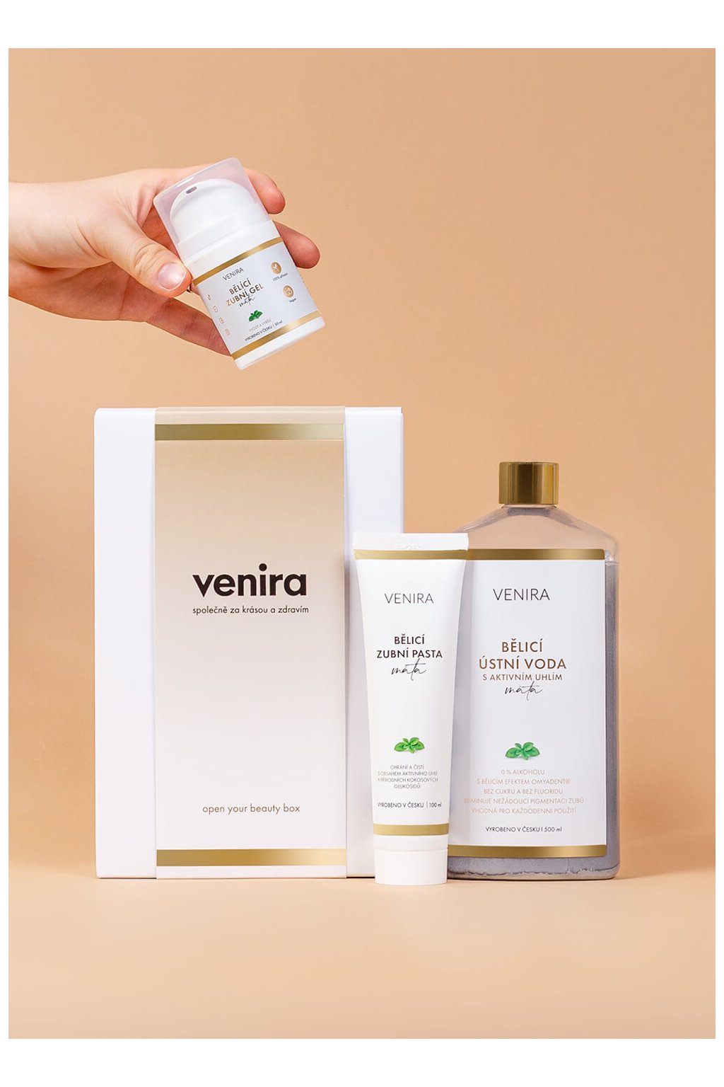 VENIRA darčeková sada bieliaca starostlivosť o zuby bieliaci zubný gél, bieliaca zubná pasta, bieliaca ústna voda s aktívnym uhlím