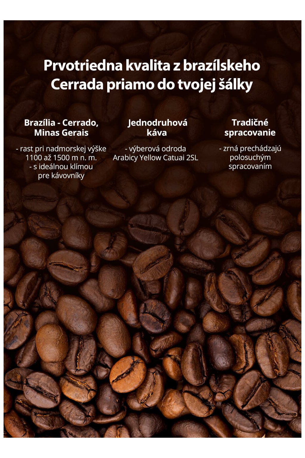 - kvalitná výberová zrnková káva 100 % Arabica z brazílskeho regiónu Cerrado, Minas Gerais