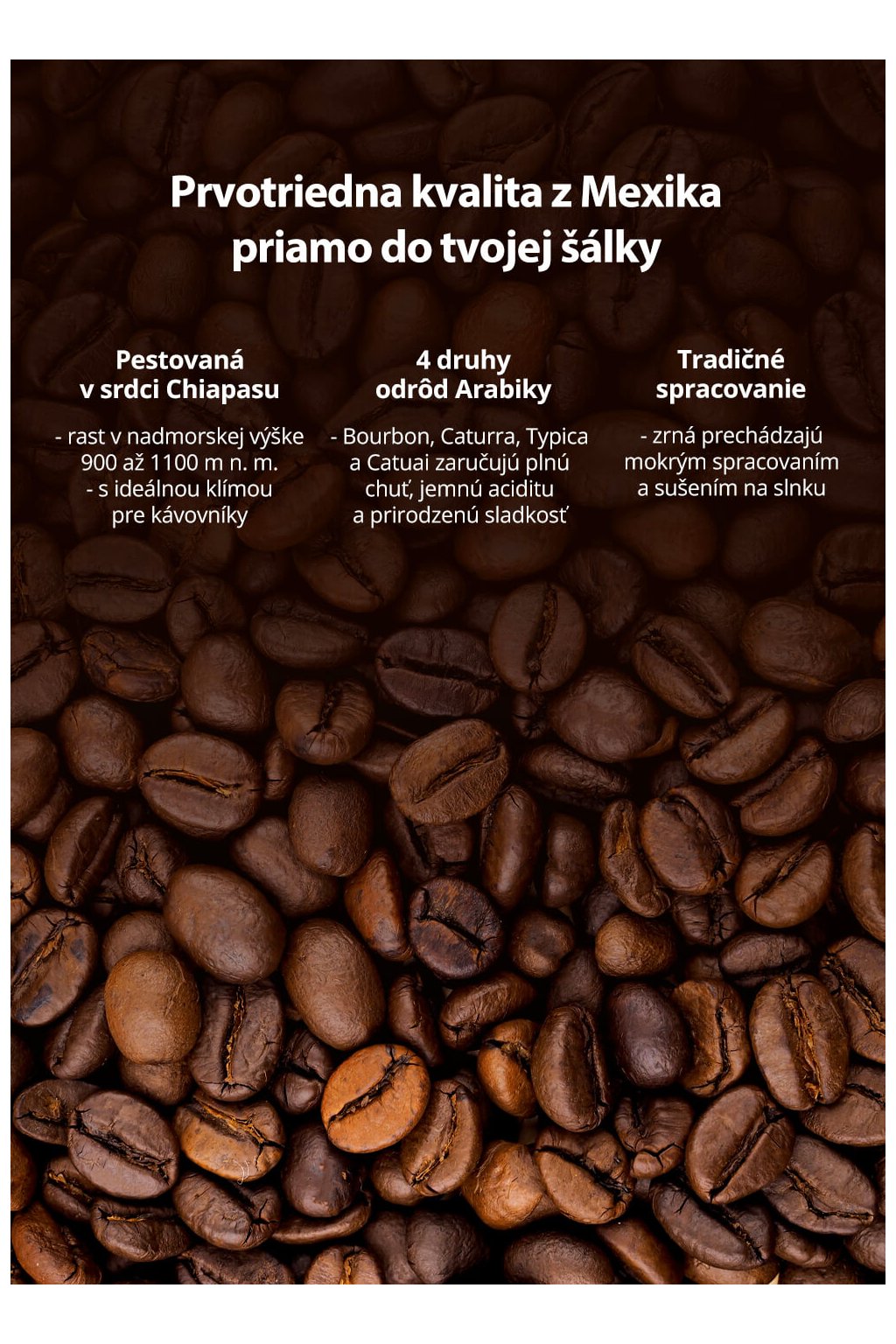 - kvalitná výberová zrnková káva 100 % Arabica z mexického regiónu Chiapas