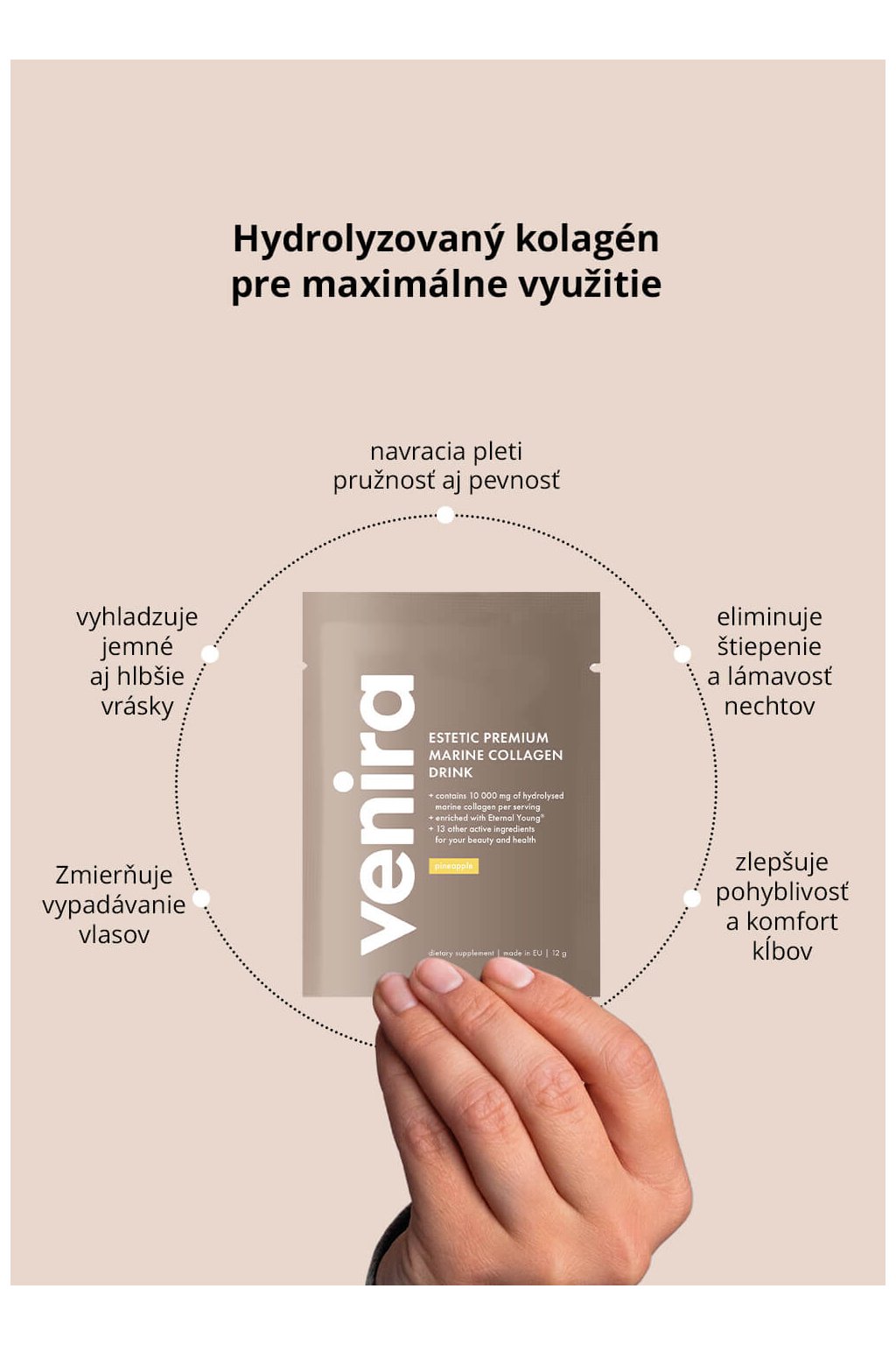 10 000 mg hydrolyzovaného morského kolagénu a ďalších 13 látok s viditeľnými omladzujúcimi účinkami, vyživuje kĺby aj väzy.