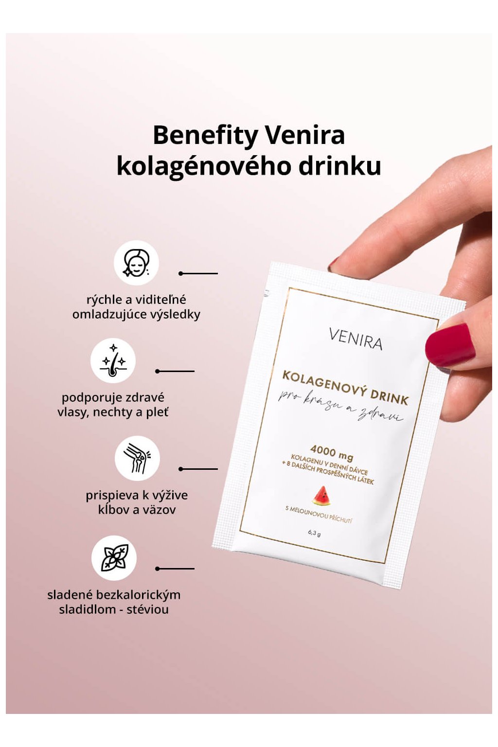 VENIRA kolagénový drink pre vlasy, nechty a pleť je vhodný ako pre ženy, tak aj pre mužov zhruba od 25 rokov, kedy v tele začína produkcia kolagénu prirodzene klesať – po prekročení 40 rokov je dokonca zastavená úplne.