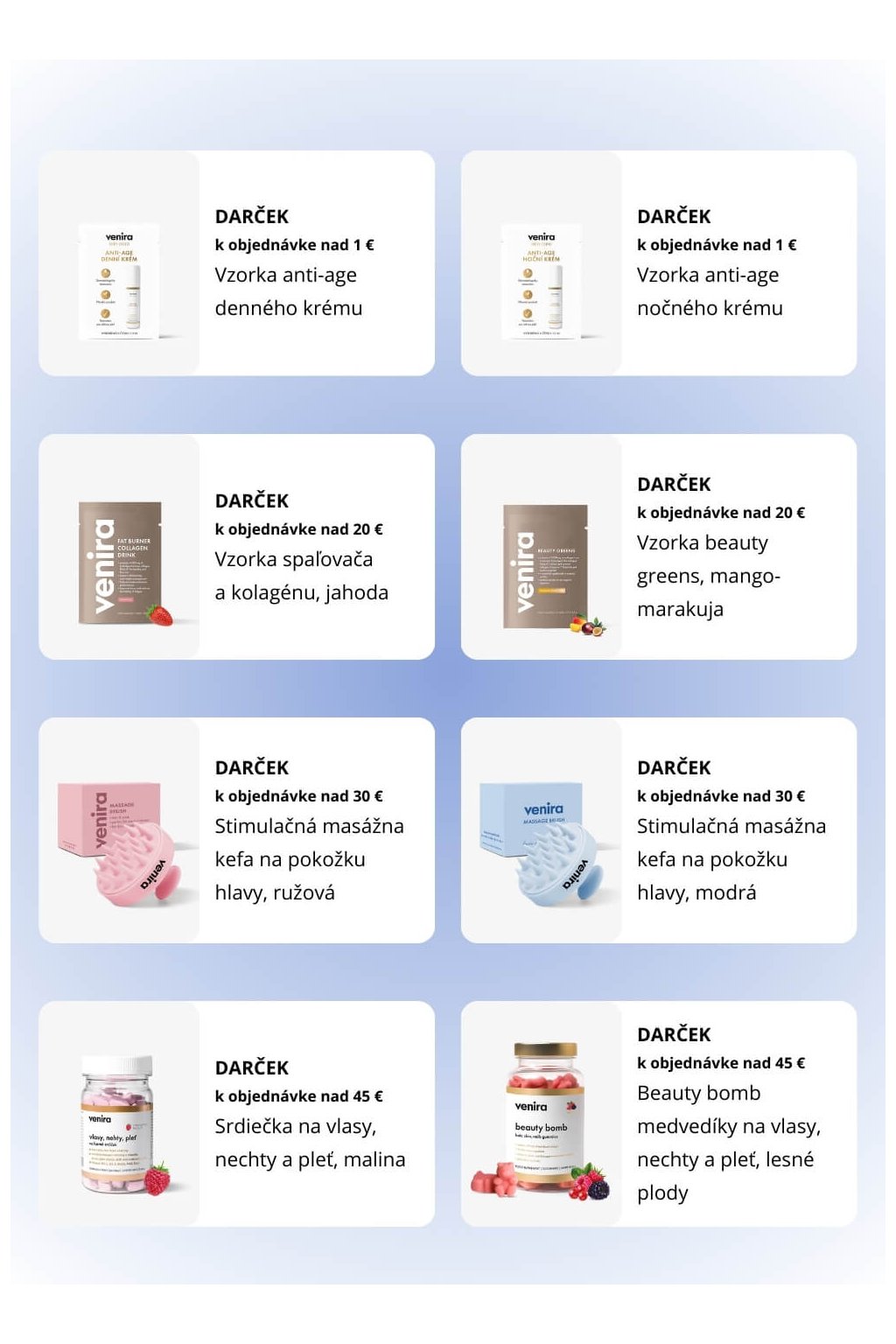 V súčasnosti máme 20 darčekov a sú odstupňované podľa hodnoty objednávky. Zobrazia sa automaticky v 1. kroku nákupného košíka, kde si môžete vybrať darček, ktorý sa vám najviac páči podľa hodnoty objednávky.