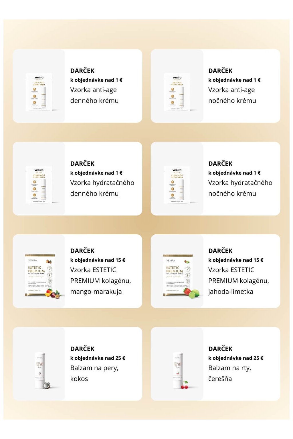 V súčasnosti máme 20 darčekov a sú odstupňované podľa hodnoty objednávky. Zobrazia sa automaticky v 1. kroku nákupného košíka, kde si môžete vybrať darček, ktorý sa vám najviac páči podľa hodnoty objednávky.