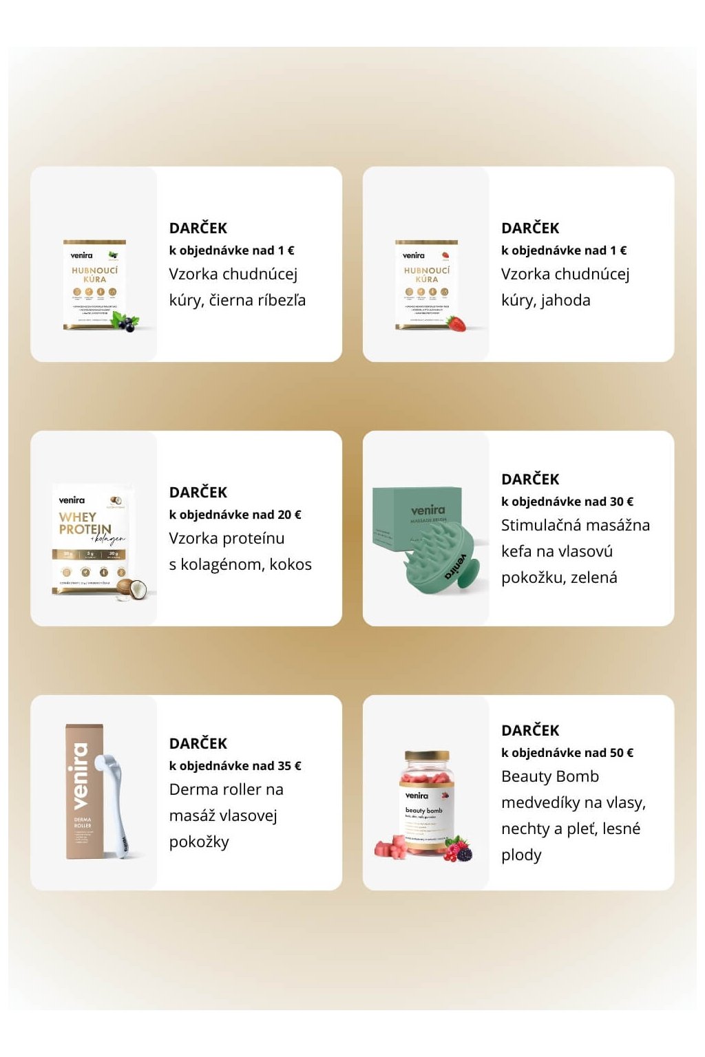 V súčasnosti máme 10 darčekov a sú odstupňované podľa hodnoty objednávky. Zobrazia sa automaticky v 1. kroku nákupného košíka, kde si môžete vybrať darček, ktorý sa vám najviac páči podľa hodnoty objednávky.