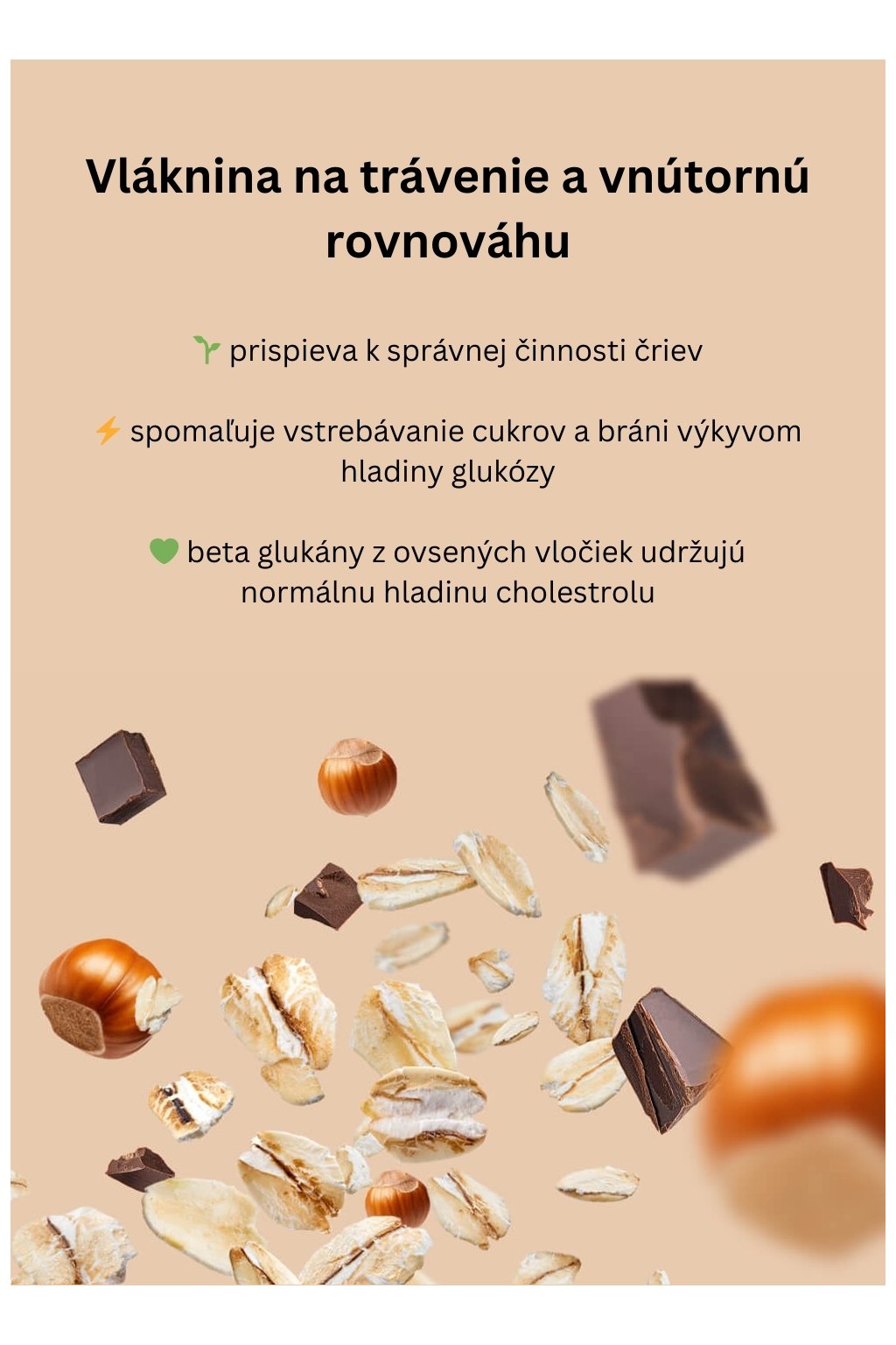 Vďaka starostlivo vybraným surovinám, ako sú prémiové celozrnné vločky, proteín z kravského mlieka, lieskové oriešky a čokoládové kôstky, spoločne s kakaovým práškom a minimom kokosového cukru, je ovsená kaša pripravená už za 1 minútu nielen zdrojom dlhodobej energie, ale aj lahodným zážitkom pre chuťové poháriky.
