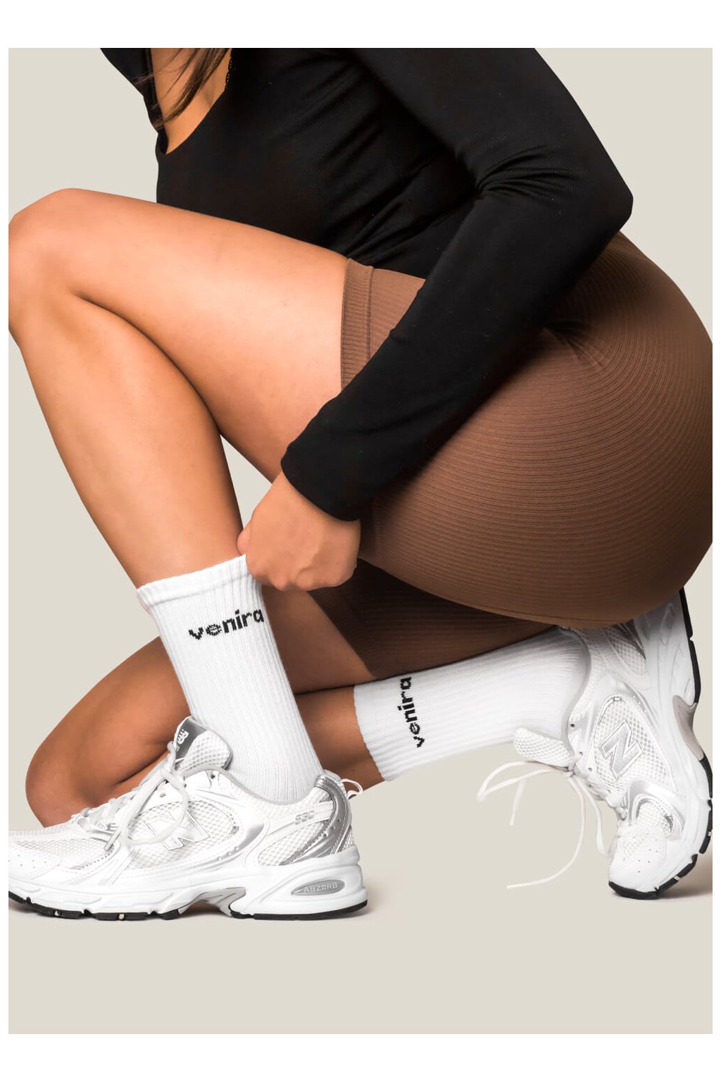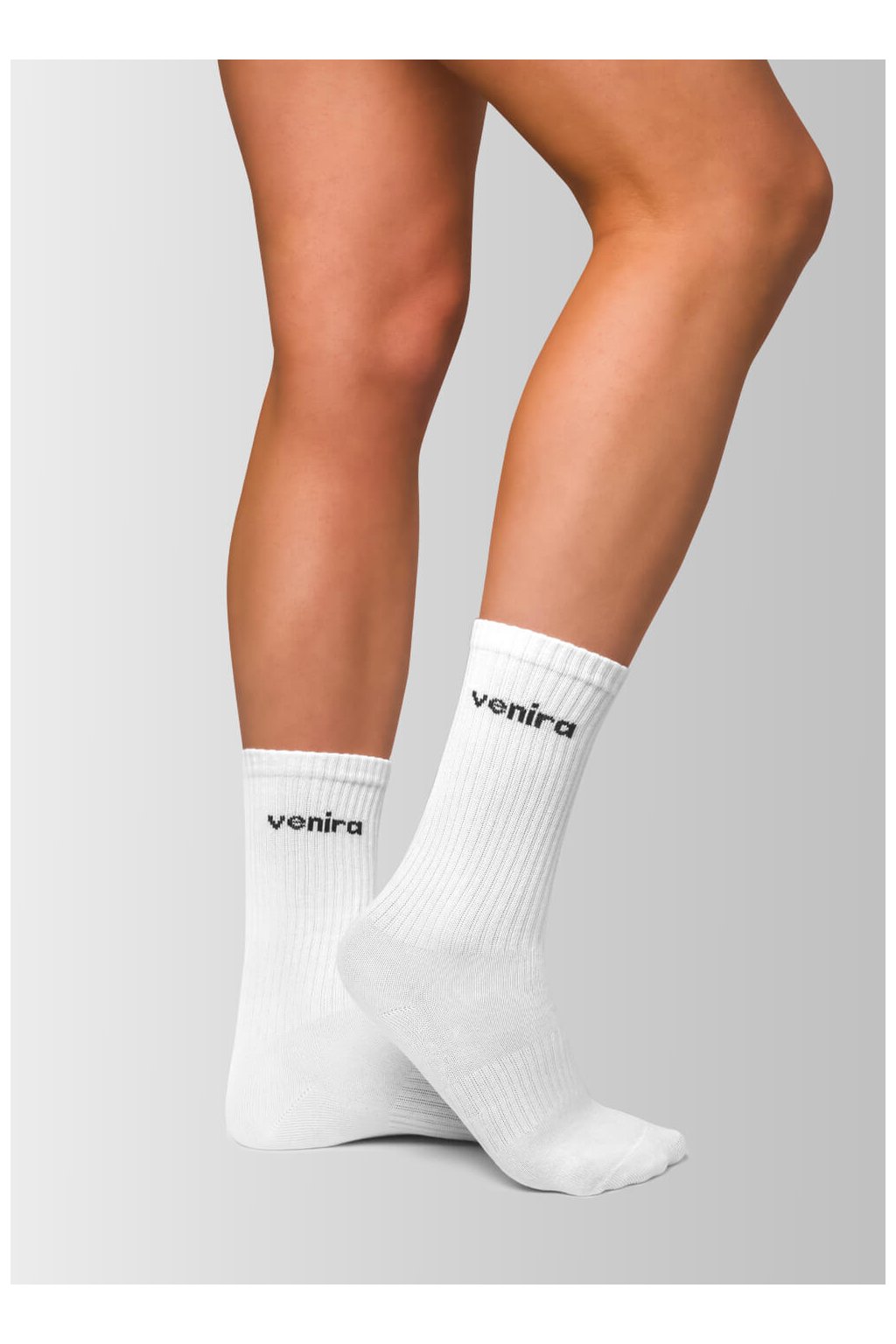 Horná časť ponožiek je rebrovaná, čo zaisťuje, že skvele drží na svojom mieste bez nepríjemného sťahovania alebo zarezávania. Celkový vzhľad podčiarkuje decentné a elegantné logo VENIRA, ktoré im dodáva šmrnc. Ponožky sú navyše vďaka trom dostupným veľkostiam navrhnuté tak, aby perfektne sedeli na každej nohe a zvládli nielen bežné nosenie, ale aj aktívne popoludnie vo fitku.