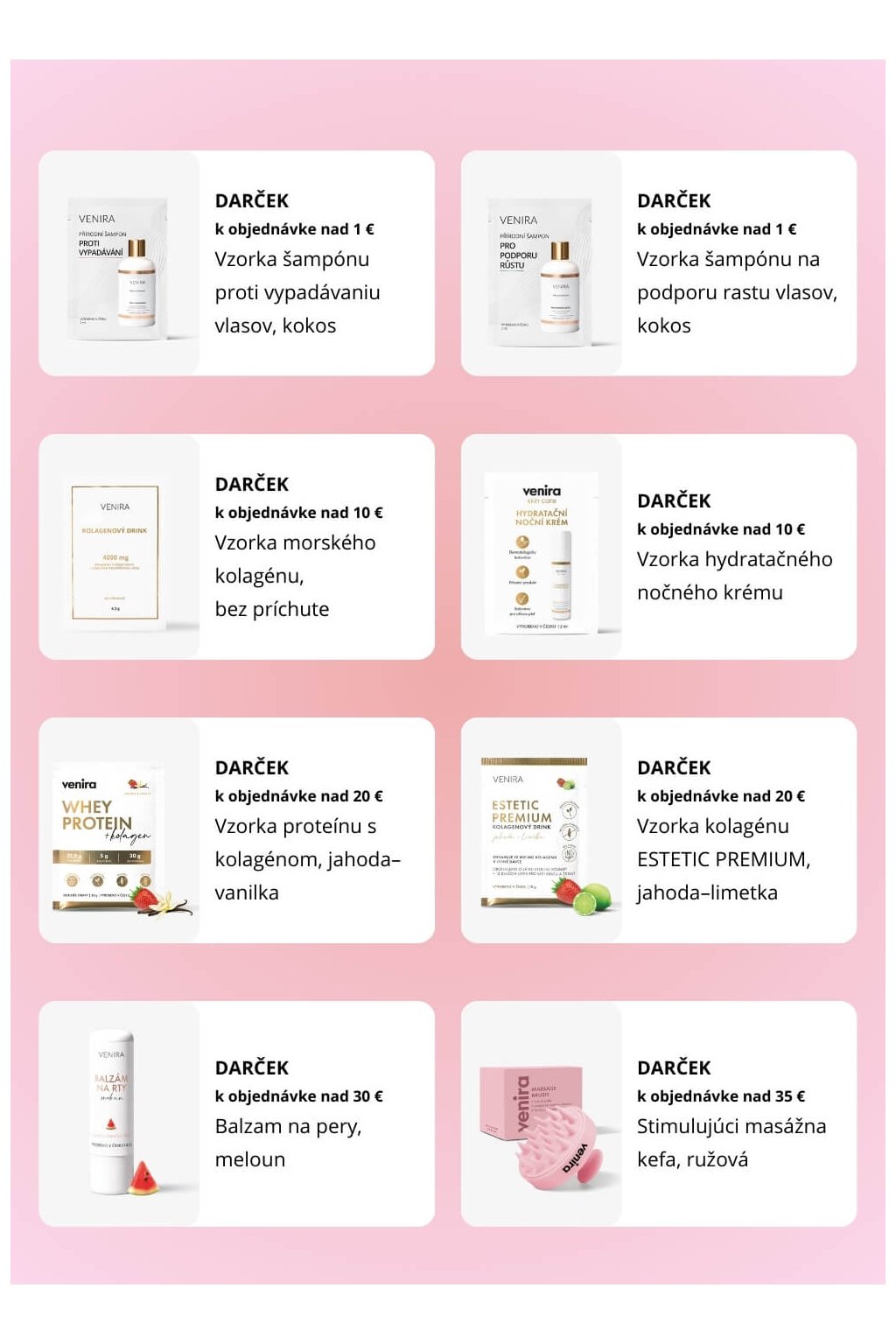 V súčasnosti máme 16 darčekov a sú odstupňované podľa hodnoty objednávky. Zobrazia sa automaticky v 1. kroku nákupného košíka, kde si môžete vybrať darček, ktorý sa vám najviac páči podľa hodnoty objednávky.