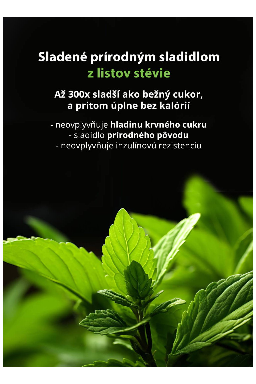 Bez cukru, lepku a laktózy. Sladené stéviou.