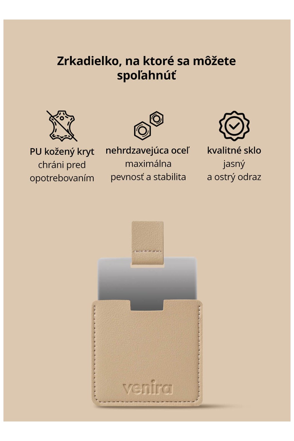 Zrkadlo je opatrené odolným PU koženým krytom, ktorý mu dodáva elegantný a luxusný vzhľad a zároveň zaisťuje jeho dlhú životnosť. Jasný a ostrý odraz bez skreslenia potom poskytuje kvalitné sklo, vďaka ktorému môžete doladiť aj tie najmenšie detaily svojho make-upu s úplnou istotou. O pevnosť a ochranu celej konštrukcie sa stará rám z nerezovej ocele, ktorý zrkadlo chráni pred poškodením a dodáva mu stabilitu.